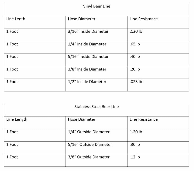 The line resistance – Every foot of the beer line has an average line resistance. The smaller the inside diameter of the line, the more resistance and the larger the diameter, the less resistance. Below is the table to help you determine the line resistance of your draft system. There are usually two common types of lines, as you can see below;