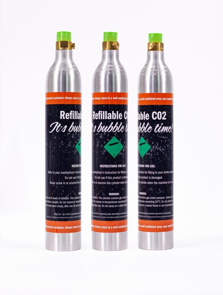 - Drinks-grade CO₂, filled and tested in the UK.